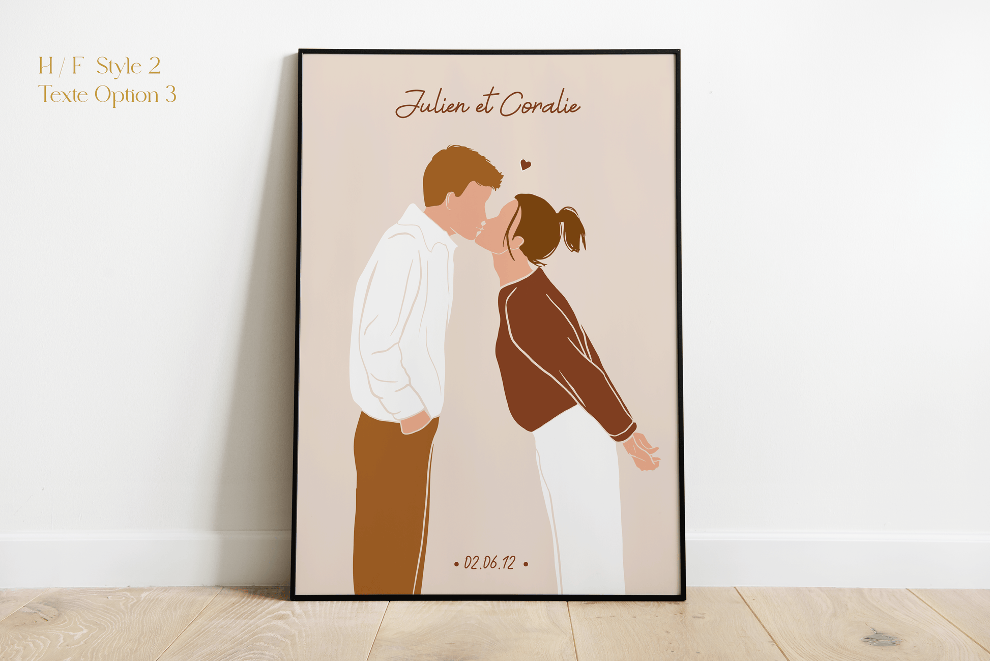 Portrait de couple avec date de rencontre, illustration personnalisée au format A4.